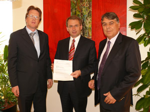 Gute Nachricht für Bauherren: LR Laimer präsentiert mit den Notaren Walter Crepaz (l.) und Paolo Pantozzi die Verpflichtungserklärung der Notare, bei Dachbodenausbauten auf einen Teil ihres Honorars zu verzichten