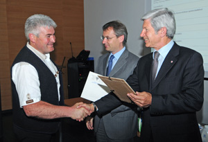 Sieben Produkte erzeugt die Sennerei Burgeis, im Bild der Geschäftsführer, der das Zertifikat aus den Händen der Landesräte Berger (rechts) und Laimer (Mitte) erhält