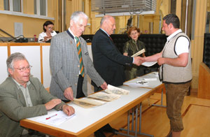 Übergabe: Einer von 114 neuen Jägern nimmt den Jagdbefähigungsnachweis von LH Durnwalder entgegen (Foto: LPA/Ravanelli)