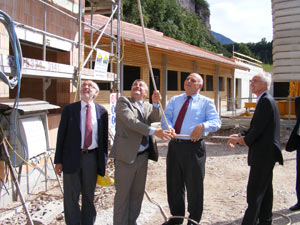 Den Baum aufgezogen: LH Durnwalder und LR Mussner bei der Firstfeier am Happacherhof