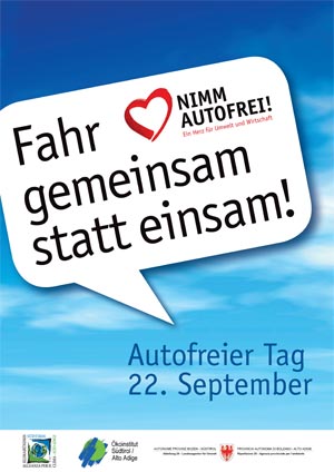 Der autofreie Tag ist eine Initiative der Landesumweltagentur und des Klimabündnisses Südtirol. In ihrem Auftrag hat das Ökoinstitut Südtirol die Koordination übernommen. Interessierte Gemeinden können sich bei diesem zum autofreien Tag anmelden (Tel. 0471 980048; E-Mail office@oekoinstitut.it). Sie werden über den Aktionstag informiert und erhalten ein Servicepaket, das unter anderem Texte zur Bewerbung des autofreien Tags in Gemeindezeitungen oder auf der Homepage der Gemeinden enthält. Zudem gibt's eine Ideensammlung zu möglichen Initiativen am autofreien Tag.