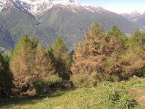 Normalerweise befällt der Graue Lärchenwickler (Zeiraphera diniana) Lärchenwälder in einer Höhe ab 1600 Metern. "Die Raupen des Falters fressen die Nadeln ganz oder teilweise ab, die Nadelreste vertrocknen, weshalb sich die Baumkrone bereits im Frühsommer braun färbt", so die Experten des Forstinspektorats im Vinschger Hauptort, die zudem darauf hinweisen, dass die Raupen des Lärchenwicklers in den Ästen der befallenen Bäume Gespinste bilden, um danach über Spinnfäden zu Boden zu gelangen.