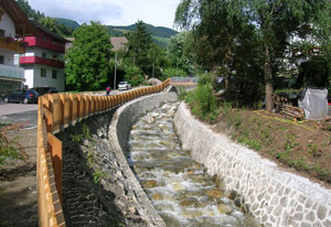 (LPA) Schritt für Schritt werden Bett und Ufermauern des Grünbachs in Kiens von der Landesabteilung Wasserschutzbauten saniert. Nun ist das zweite Baulos abgeschlossen worden, mit dem die nah am Bach liegenden Häuser und Infrastruktur vor Überflutungen geschützt werden sollen. "Die beengten Verhältnisse haben die Arbeiten allerdings technisch aufwändig gemacht", so Abteilungsdirektor Rudolf Pollinger.