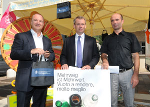 LPA - Mit der Aktion "Mehrweg ist mehr Wert" wollen die Landesagentur für Umwelt und die Verbraucherzentrale Südtirol (VZS) im September und Oktober die Vorteile von Mehrwegflaschen aufzeigen. Die Aktion wurde heute, 8. September, in Bozen vorgestellt. "Wir wollen nicht nur die Müllmenge verkleinern, sondern auch Ressourcen sparen und die CO2-Emissionen reduzieren", erklärte Umweltlandesrat Michl Laimer.