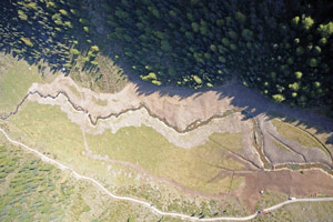 Wahrscheinlich um mehr Weidefläche zu erhalten, war der Schlandraunbach bereits im vorletzten Jahrhundert in ein neues Bett an der linken Talseite gezwängt worden. Dieses Bett ist im Laufe der Jahrzehnte schmaler und schmaler geworden, weil sich immer mehr Material darin abgelagert hat. "Weil das Bachbett zudem rund ein bis zwei Meter höher lag als die Talsohle, haben bereits relativ kleine Niederschlagsmengen gereicht, um ihn über die Ufer treten und die Almflächen überfluten zu lassen", so Pollinger.