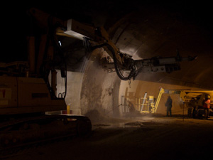 (LPA) Rund um die Uhr wird derzeit im Sigmundskroner Tunnel der Schnellstraße MeBo gearbeitet, um einen neuen Stollen als Verbindung zwischen den bestehenden Tunnelröhren vorzutreiben. "Die neue Verbindung wird als Fluchtstollen dienen und ermöglicht einen schnelleren Zugriff, wann immer in einer der beiden Röhren etwas passieren sollte", so Landesrat Florian Mussner.