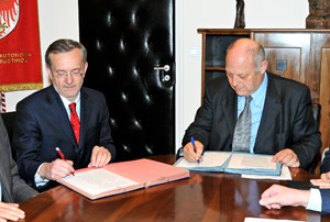 LPA - Südtirols Handelskammer muss ihre Ausgaben auch im kommenden Jahr auf 21,58 Millionen Euro beschränken, darf allerdings ihr Personal um eine Stelle ausbauen. Ausnahmeregeln können bei Übernahme neuer Zuständigkeiten vereinbart werden. Das sieht die Vereinbarung zum Stabilitätspakt vor, die Landeshauptmann Luis Durnwalder und Handelskammerpräsident Michl Ebner heute (18. November) unterzeichnet haben.