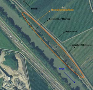 Im von den Arbeiten betroffenen Abschnitt bei Terlan verläuft zwar der Radweg direkt am Fluss, zwischen Radweg und Bahntrasse liegt allerdings ein landeseigenes Grundstück, das in die von Peter Egger, Direktor des zuständigen Landesamts, geplante Revitalisierung einbezogen wird. So werden der Etschdamm und der darauf verlaufende Radweg in Richtung Bahntrasse verlegt. Dazu wird die gesamte Fläche um einige Meter abgesenkt, Böschung und Ufer werden unterschiedlich steil strukturiert, um verschiedene Lebensräume zu schaffen.