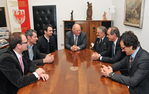 Nachdem er jahrelang die Südtiroler Bäckerinnung geführt hat, ist Richard Schwienbacher in den Ruhestand getreten. Er, sein Nachfolger als Innungsmeister, Benjamin Profanter, sowie der Vorstand der Bäckerinnung hat sich heute begleitet von Werner Frick, Direktor des Handels- und Dienstleistungsverbands, beim Landeshauptmann eingefunden, um diesem eine Reihe von Wünschen vorzubringen. Zunächst hat Durnwalder den Bäckern - in erster Linie dem ausgeschiedenen Innungsmeister Schwienbacher - aber seine Anerkennung ausgesprochen.