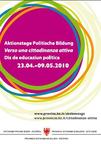 Die Aktionstage Politische Bildung, die im deutschsprachigen Ausland bereits Tradition haben, finden heuer zum dritten Mal in Südtirol statt. Für dieses Kooperationsprojekt der beiden Landesämter für Weiterbildung und der drei Pädagogischen Institute werden im Zeitraum 23. April bis 9. Mai 2010 Veranstaltungen zur Politischen Bildung und zum diesjährigen Schwerpunktthema "Solidarität und Zivilcourage" im ganzen Land organisiert.