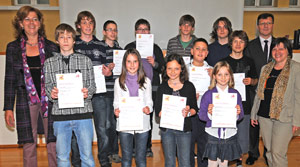 Zum fünften Mal haben sich Südtirols Schulen in diesem Jahr am Wettbewerb "Känguru der Mathematik" beteiligt. Stichtag war der 18. März 2010. An diesem Tag, dem Känguru-Tag, haben sich Schülerinnen und Schüler der dritten bis zur 13. Klasse in ganz Europa an mathematische Multiple-Choice-Aufgaben gemacht. Sie haben versucht, innerhalb von 75 Minuten die richtigen Lösungsmöglichkeiten für bis zu 30 Aufgaben herauszufinden. Die jeweils fünf Besten der 7760 Südtiroler Schülerinnen und Schüler, die sich am Wettbewerb beteiligt haben, wurden heute durch Schullandesrätin Sabina Kasslatter Mur, Schulamtsleiter Peter Höllrigl sowie Wettbewerbskoordinatorin und Inspektorin für den mathematisch-naturwissenschaftlichen Bereich am Deutschen Schulamt, Marta Herbst Spöttl, ausgezeichnet.