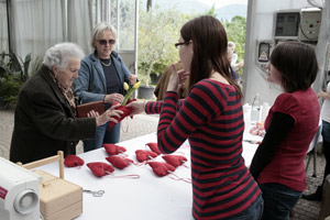 (LPA) Mit selbst gebastelten Filzherzen, gelben Tulpen und einem erfrischenden Erdbeerdrink überraschten die Schülerinnen und Lehrpersonen der Fachschule für Hauswirtschaft Frankenberg in Tisens die Besucherinnen und Besucher beim Tag der offenen Tür der Stadtgärtnerei Meran.