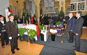 In der Zwischenzeit steht der Innenhof der Bevölkerung offen. Bereits wenige Minuten nach Öffnung der Tore hatte sich eine Menschenschlange gebildet, um die Gelegenheit zu nutzen, dem Altlandeshauptmann persönlich die letzte Ehre zu erweisen.