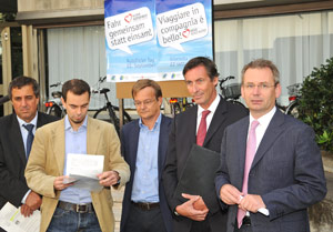 Als "symbolische Zukunftsbotschaft" bezeichnete Mobilitäts-Landesrat Thomas Widmann den Ort der Pressekonferenz auf zwei Autostellplätzen. "Mittlerweile ist fast im ganzen Land der Südtirol-Takt eingeführt", führte Widmann aus, "nahezu alle Täler sind durch öffentliche Verkehrsmittel verbunden." Der Vizepräsident des Ökoinstitutes, Helmuth Moroder, gab seiner Freude Ausdruck, die Initiative des autofreien Tages am Mittwoch, dem 22. September, als Abschluss der europäischen Woche der Mobilität koordinieren zu dürfen. Die Zeit sei reif für einen Paradigmenwechsel, unterstrichen die beiden Landesräte, denn das Auto sei nicht nur Verursacher der Umweltverschmutzung, sondern stelle auch ein Platzproblem dar. Der autofreie Tag soll zur Bewusstseinsänderung beitragen und ist eine Einladung, das persönliche Mobilitätsverhalten zu überdenken und etwas Neues zuwagen, das besser sein kann.