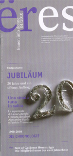Der 20-jährigen Geschichte des Landesbeirates für Chancengleichheit ist die Nummer 4/2010 von "eres" gewidmet, in dessen Leitartikel Susanne Pitro begründet, warum der Beirat nach zwei Jahrzehnten nicht von der Bildfläche verschwinden darf. Maria Cristina De Paoli berichtet über die Erfahrungen der italienischen Vizepräsidentinnen des Beirats, Luisa Gnecchi, Giuliana Boscheri, Alessandra Spada und Patrizia Trincanato. Auf 17 Seiten werden in der Folge die Erfolge der vergangenen 20 Jahre aufgelistet, die der Beirat für sich verbucht. Mit den besten "Goldenen Hosenträgern" für frauenverachtende Äußerungen der vergangenen 20 Jahre und einem Überblick über die Zusammensetzung der seit 1990 bestellten fünf Beiräte schließt die Jubiläumsausgabe.