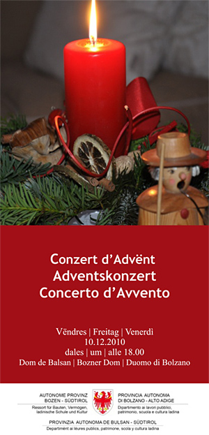 Die Einladung zum Konzert ist dreisprachig: Conzert d'Advent, Adventskonzert, Concerto d'Avvento, eingeladen sind Interessierte aller Sprachgruppen. Das Konzert beginnt am Freitag, dem 10. Dezember, um 18.00 Uhr im Dom Mariä Himmelfahrt in Bozen.