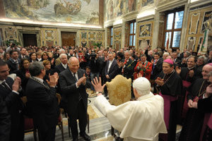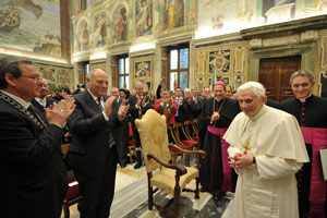 Die Privataudienz für LH Durnwalder, die Landesräte Sabina Kasslatter Mur, Roberto Bizzo, Michl Laimer und Richard Theiner sowie Bischof Karl Golser und die Eisacktaler Delegation folgte im Anschluss an die Messe. Papst Benedikt XVI. empfing die Südtiroler in der Sala Clementina, Landeshauptmann Durnwalder hatte die Aufgabe übernommen, Grußworte im Namen der Südtiroler an den Papst zu richten. Darin unterstrich er, dass Südtirol vor allem für das friedliche Zusammenleben dreier Sprachgruppen und den Schutz von deren Identität stehe. "Unsere Autonomie kommt nicht nur einer einzigen Sprachgruppe, sondern allen in Südtirol lebenden Bürgern zugute. Sie ist gekennzeichnet von gegenseitigem Respekt", sagte Durnwalder. In erster Linie gehe es dabei um die Pflicht der Solidarität, die in Südtirol die zahlreichen ehrenamtlich Tätigen im besonderen Maße ernst nähmen. "Sie setzen sich das ganze Jahr über für die Allgemeinheit ein und sind ein prägender Teil unserer Gesellschaft", betonte der Landeshauptmann. Aus diesem Grund seien heute beim Besuch des Heiligen Vaters auch sehr viele Vereine - Musikkapelle, Chor, Schützen - dabei: "Wir sind genau so zu Ihnen gekommen, Heiliger Vater, wie wir sind", unterstrich Durnwalder.