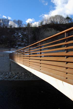 Neben der schlanken Tragstruktur aus Sichtbeton prägen vor allem die filigranen Stahlgeländer das Erscheinungsbild der Brücke. Diese nehmen einerseits durch ihre Gestaltung Bezug zur Holzbrücke, andererseits durch die Materialwahl und Farbgebung. Von außen betrachtet wirken die Stahlgeländer geschlossen, analog zur historischen Holzbrücke. Von innen sind sie jedoch transparent durch schräg gestellte horizontale Stahllamellen, welche Durchblicke auf den darunter vorbei fließenden Eisack ermöglichen. „Als Material für die Geländer wurde brauner Corten-Stahl gewählt, der mit seiner lebendigen, unterschiedlich patinierten Oberfläche in einen chromatischen Dialog mit dem sonnengebräunten Holz der historischen Brücke tritt“, erklärt Ausserhofer.