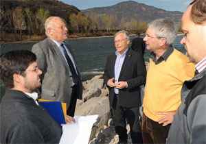 Gemeinsam mit Ressortdirektor Heinrich Holzer, Abteilungsdirektor Rudolf Pollinger, den zuständigen Technikern und Vorarbeitern hat Landeshauptmann Durnwalder zuerst die Baustelle am Eisack in Sterzing in der Nähe der Tennishalle besichtigt, wo das erste Baulos zum EU-Projekt „Hochwasserschutz Sterzing“ läuft, das 800.000 Euro kostet. Für die kommenden Jahre sind weitere Verbauungsmaßnahmen in Richtung Norden geplant. Vor Ort waren auch der Sterzinger Bürgermeister Fritz Karl Messner und die Pfitscher Vizebürgermeisterin Renate Ainhauser Delueg auf der Baustelle anwesend.