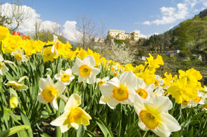 Auch in diesem Frühling begrüßen wieder 130.000 bunte Frühjahrsboten die Gäste der Gärten von Schloss Trauttmansdorff; darunter auch die weltweit einzigartigen Sprösslinge der "Trauttmansdorff-Tulpe". Im Laufe der Saison wird auch dieses "Trauttmansdorff"-Pflanzensortiment erweitert. Prächtige Azaleen, zarte japanische Zierkirschen und elegante Magnolien empfangen die Besucher und Besucherinnen in den Waldgärten, während die Klassiker Milchstern, Hundszahn, Kaiserkrone, Tulpe und Narzisse auf dem Streifzug durch die zwölf Hektar große Anlage blühen. Attraktiver Blickfang und beliebtes Fotomotiv ist ein spektakulärer Wasserfall aus über 20.000 Mohnblumen, der sich gelb–orange leuchtend über die Hänge ergießt. Farbenprächtiger Höhepunkt in den Sonnengärten stellt die Blumenwiese dar, auf der sich Abertausende weiße und in allen Rottönen leuchtende Tulpen den wärmenden Sonnenstrahlen öffnen.