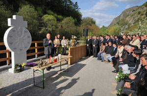 12. April, 9.01 Uhr, genau ein Jahr nach dem tragischen Unglück der Vinschger Bahn in der Latschander zwischen Kastelbell und Latsch ist heute ein Gedenkstein für die neun Opfer gesegnet worden. "Es waren Bilder, die wir nie zuvor gesehen hatten, Bilder, die wir nie vergessen werden", so Landeshauptmann Luis Durnwalder, der allerdings auch an den selbstlosen Einsatz der zahlreichen Rettungskräfte erinnert hat.