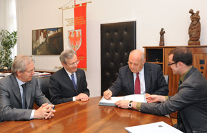 LPA - Das Land Südtirol wird der Handelskammer in Fragen des Europarechts verstärkt zur Seite stehen. Landeshauptmann Luis Durnwalder und Handelskammerpräsident Michl Ebner unterzeichneten heute (Dienstag, 26. April) im Bozner Palais Widmann eine Vereinbarung, mit der die europarechtliche Beratung für die Südtiroler Wirtschaft durch die Landesabteilung Europa-Angelegenheiten grundgelegt wird.
