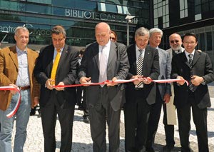 LPA - Nach dem Kinderhort und der Feuerwehrhalle haben Landeshauptmann Luis Durnwalder und die Landesräte Florian Mussner, Christian Tommasini und Hans Berger heute, 19. Mai, im Bozner Stadtviertelteil Rosenbach das neue Kulturzentrum mit Bibliothek, das neue Studentenwohnheim, die italienische Landesfachschule für soziale Berufe sowie die neue Tiefgarage und einen neuen Platz eröffnet. Damit ist das erste Baulos auf dem Areal der Ex-Mignone-Kasernen in Bozen-Haslach abgeschlossen.