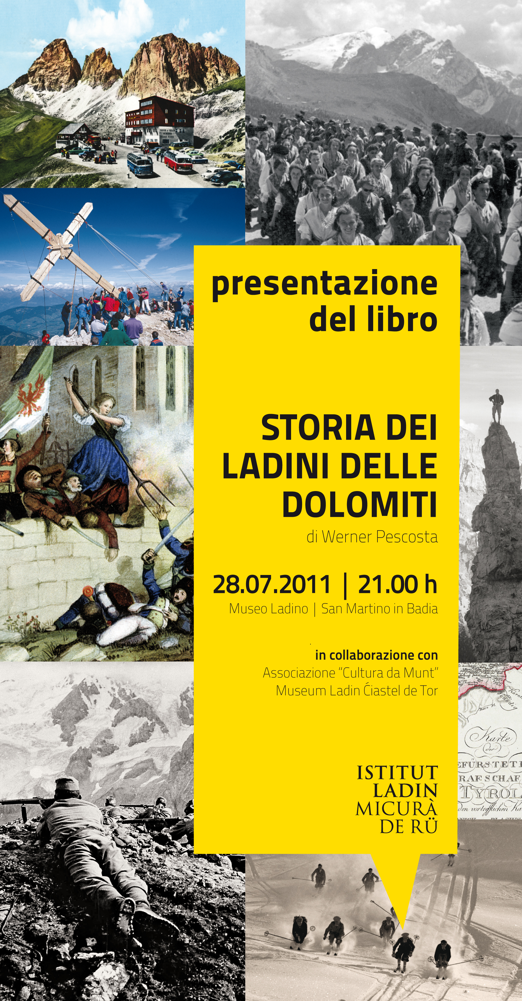 Werner Pescosta wird sein Buch mit dem Titel "Storia dei ladini delle Dolomiti" (Geschichte der Dolomiten-Ladiner) am Donnerstag, dem 28. Juli, um 21.00 Uhr im Museum Ladin Ciastel de Tor in St. Martin in Thurn vorstellen. Das Werk umfasst 760 Seiten mit 400 Fotografien, 33 historischen Karten, Dokumenten, Grafiken und Illustrationen. Bei günstigen Wetterbedingungen wird der Autor Auszüge und Fotos im Schlosshof vorstellen, andernfalls findet die Veranstaltung in den Innenräumen statt.