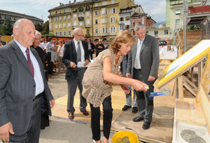 LPA - Zwölf Unterrichtsräume und drei Laboratorien und 18 Studiennischen soll die Landesfachschule für Sozialberufe „Hannah Arendt“ in Bozen bis 2013 dazu bekommen. Landeshauptmann Luis Durnwalder und die Landesräte Florian Mussner und Sabina Kasslatter Mur haben heute, 2. September, symbolisch den Grundstein für den Zubau der Schule gelegt. Die Schule wird unterirdisch um vier Geschosse erweitert.