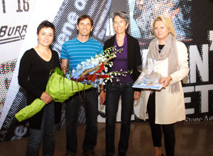 Freude über die 200.000sten Besucher der Sonderausstellung Ötzi 20 (v.li.): Museumsdirektorin Fleckinger, Ehepaar Lazzarotto, Ressortdirektorin Dalla Torre"Wir freuen uns sehr", betonte Kulturressortdirektorin Karin Dalla Torre, "dass dieses außergewöhnliche Ausstellung so erfolgreich ist; sie erschließt auch neue Publikumsschichten und zieht nicht nur Touristen an, sondern auch sehr viele Einheimische, vor allem Familien." Die Lehrerin Nicole Lazzarotto und der Projektmanager Marco Lazzarotto aus der Nähe von Zürich in der Schweiz lösten heute die Eintrittskarte mit der Nummer 200.000 seit der Eröffnung der Sonderausstellung am 1. März. Die beiden begeisterten Kletterer und Wanderer hatten in ihrer Urlaubsgestaltung einen Tag der Kultur gewidmet.