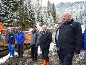 Erste Station war der Getrumbach bei Reinswald. Nach den heftigen Unwettern im September 2009, bei dem der Getrumbach große Schäden angerichtet hat, sind dort umfangreiche Sicherungsmaßnahmen am Bachbett im Gange. "Um Abrutschungen an den steilen Bachflanken zu verhindern, wird die Bachsohle mit insgesamt 18 Konsolidierungssperren aus großen Zyklopensteinen stabilisiert. Die Bauwerke werden bewusst niedrig gehalten und die Sichtflächen ohne erkennbare Betonfugen errichtet, um das Landschaftsbild nicht zu beeinträchtigen", erklärt Abteilungsdirektor Rudolf Pollinger, der die Kosten für die Eingriffe am Getrumbach mit rund 500.000 Euro beziffert.