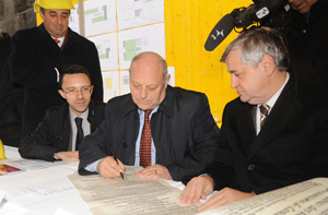 Anschließend unterzeichneten LH Luis Durnwalder, LR Christian Tommasini und LR Florian Mussner die Pergament-Urkunde zur Grundsteinlegung und mauerten sie in den Grundstein ein, der von Don Erminio Baldo gesegnet wurde.