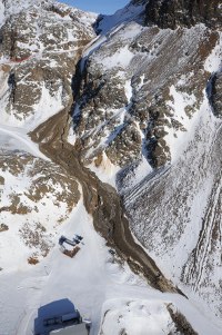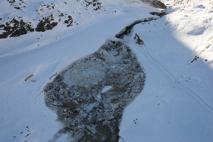 Die drei Landestechniker sind entlang der gestern abgegangenen Wassermassen aufgestiegen und haben die Ursache des Zwischenfalls ausmachen können. „Aus dem Gletschersee ist Wasser durch verklüftetes Gestein ausgetreten und hat sich unterhalb des Sees in einer Geländemulde gesammelt. Aus dieser Mulde konnte das Wasser nicht abfließen, weil der natürliche Abfluss durch Schnee und Eis versperrt war. Unter der aufgestauten Wasserlast ist die Abdämmung aus Schnee und Eis schließlich gebrochen, so dass sich aus den austretenden Wassermassen eine kleine Flutwelle gebildet hat“, erklären Arturo Magno, Roberto Dinale und Volkmar Mair. Alle von Menschenhand errichteten Schutzbauten seien jedoch intakt geblieben, der derzeit unter Schnee liegende See sei bis auf den Boden abgesunken