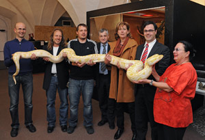 Kulturlandesrätin Sabina Kasslatter Mur, Bautenlandesrat Florian Mussner und Vito Zingerle, Direktor des Naturmuseum Südtirol, nahmen heute (23. April) die offizielle Eröffnung vor. Anwesend waren auch die Reptilienexperten und Züchter Ursula Happ und Alfred Wallner aus Kärnten (www.reptilienwelt.at), die die Ausstellung in Zusammenarbeit mit Ales Mlinar aus Slowenien kuratiert haben, Ausstellungskoordinator Massimo Morpurgo vom Naturmuseum, sowie Johanna Plasinger Scartezzini in Vertretung der Stiftung Südtiroler Sparkasse, die die Ausstellung tatkräftig unterstützt hat.