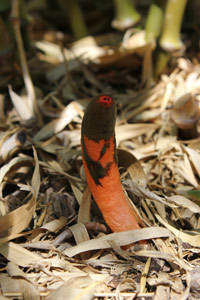 LPA - Derzeit bietet sich den Besucherinnen und Besuchern der Gärten von Schloss Trauttmansdorff ein ungewöhnlicher Anblick: Inmitten des Bambusgartens ist ein seltener Pilz aufgetaucht: der Mutinus caninus, landläufig Gemeine Hundsrute oder auch Kleiner Hundepenis genannt.
