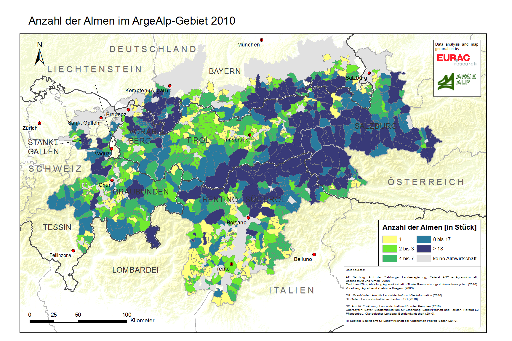 LPA - Im Gebiet der Arge Alp werden derzeit rund 9500 Almen bewirtschaftet. Spitzenreiter ist Tirol mit 2151 Almen gefolgt von Salzburg (1783) und Südtirol (1739). Mit 776 Almen bzw. 390 Alpen werden im Trentino und St. Gallen am wenigsten Almen bewirtschaftet. Diese Daten sind erste Ergebnisse des Arge-Alp-Projekts Almatlas, die im Rahmen der 26. Almwirtschaftstagung am 27. Juni vorgestellt werden.