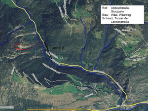 Die Abbruchstelle, präzisiert Amtsdirektor Mair, befindet sich nach dem zweiten Tunnel auf der orographisch rechten Seite, wo Schloss Juval steht. Landesgeologe Konrad Messner hat bei einem ersten Lokalaugenschein am Vormittag eine Anbruchstelle im steilen Gelände festgestellt: der Schnalswaal und der Waalweg wurden heruntergerissen. "Nach einer Stunde," führt Volkmar Mair aus, "stand fest, dass keine Gefahr besteht."