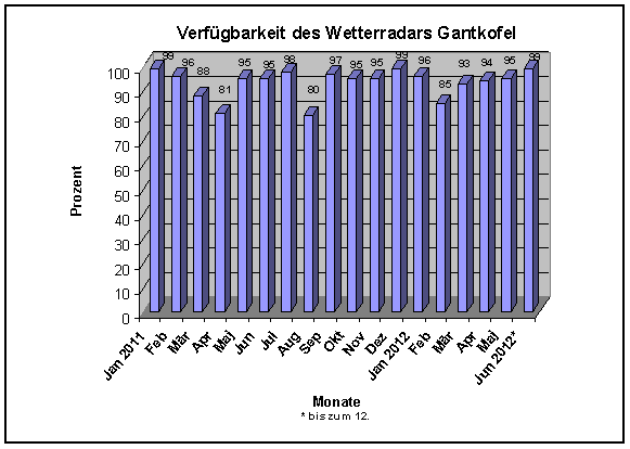 Dass diese Vorgangsweise der richtige Weg ist, bestätigt auch die Statistik zur Verfügbarkeit des Radars im Jahre 2011 (Dokument im Anhang). Über das gesamte Jahr war der Wetterradar zu 93 Prozent verfügbar, in manchen Monaten sogar zu 99 Prozent. Michela Munari, Direktorin des Hydrographischen Amtes, erläutert: "Alle Anstrengungen dienen dazu, die Verfügbarkeit und Qualität der Wetterradar-Informationen weiterhin zu verbessern und damit den Meteorologen und allen Interessierten einen bestmöglichen Service zu bieten."