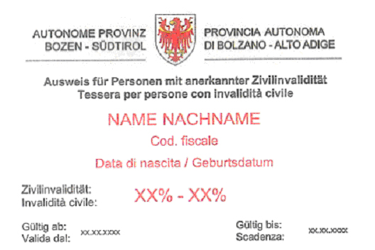 Die Landesabteilung für Familie und Sozialwesen teilt mit, dass die neuen Ausweise für Personen mit anerkannter Zivilinvalidität nun in Umlauf gebracht werden (Muster im Anhang). Gesundheits- und Soziallandesrat Richard Theiner hat den Südtiroler Sanitätsbetrieb beauftragt, alle Personen, die Anrecht auf einen solchen Ausweis haben, zu benachrichtigen. Im Schreiben ist das weitere Vorgehen für die Antragsstellung erläutert und das Antragsformular liegt bei. Anrecht auf einen solchen Zivilinvalidenausweis haben Personen mit mindestens 46-prozentiger Invalidität.