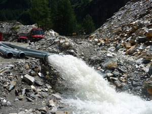 Auch heute war der von der Landesregierung beauftragte Landeszivilschutz in der Bezirksleitstelle in Sterzing wieder mit allen an den Aufräumarbeiten beteiligten Organisationen damit befasst, die anstehenden Arbeiten zu koordinieren, doch zunächst konnte man eine weitere relativ ruhige Nacht abhaken. Besonderes Augenmerk galt dabei dem Pfitscherbach bei Wiesen, den Deichwachen die gesamte Nacht über kontrolliert hatten, nachdem der Pegelstand immer noch hoch war. Grund dafür ist das Geschiebe, das der Bach aus den steilen Abschnitten nach unten transportiert und dort ablagert, wo das Gefälle geringer ist. Es ist nun an der Landesabteilung Wasserschutzbauten, den Bachlauf an den betroffenen Stellen auszubaggern, eine nicht zu unterschätzende Aufgabe, sind doch rund 35.000 Kubikmeter Material abzutransportieren.