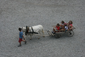 Beim Eintritt in die Festung fiel der weiße Esel Lilo ins Auge: Dieser zog, vor einen Leiterwagen gespannt, die Besucherinnen und Besucher durch die Festung Franzensfeste - eine empirische Auseinandersetzung mit dem Werk von Gabriele Oberkofler in der Ausstellung Panorama 4. Oberkofler zeigt einen Leiterwagen, der mit aus Obststeigen gebauten Bauernhofgebäuden beladen ist. Der gestrige zweite Public-Sunday zitierte das Werk Oberkoflers nicht nur mit dem Eselsgespann, sondern auch mit einer Bastelwerkstatt, bei der Kinder Bauernhöfe oder andere Objekte aus Obststeigen bastelten und damit selbst durch die Ausstellung zogen.