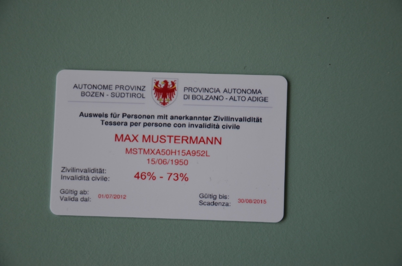 Name, Steuernummer und Grad der Beeinträchtigung: Das sind die Angaben, die der neue Ausweis für Personen mit anerkannter Zivilinvalidität enthält. Bisher, führte Landesrat Richard Theiner bei der Vorstellung aus, musste der medizinische Befund der Ärztekommission zur Feststellung der Invalidität auf einem Zettel im DIN-A4-Format vorgezeigt werden. Das, unterstrich der Landesrat, war nicht im Sinne der Betroffenen und gewährleistete nicht den Datenschutz. Am 26. März dieses Jahres genehmigte die Landesregierung deshalb die Einführung des neuen Ausweises.