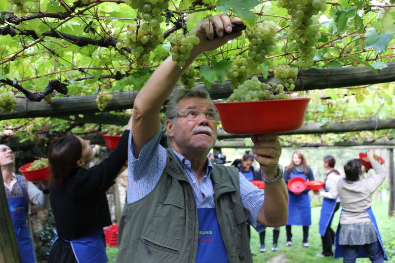 Am Dienstag wurde die feierliche Weinlese an der Versoaln-Rebe, der größten und wohl auch ältesten Rebe der Welt, vorgenommen. Die Gärten von Schloss Trauttmansdorff hatten zum Wimmen mit anschließender Verkostung von Weinen alteingesessener Südtiroler Rebsorten auf Schloss Katzenzungen geladen.