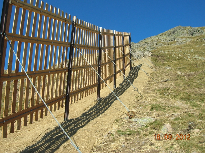 Der Startschuss für die Lawinenverbauungsarbeiten fiel im Jahr 2007, abgeschlossen wurden sie in den vergangenen Tagen, im Herbst 2012. Angesichts der Höhenlage der Baustelle, war ein Arbeiten nur über die Sommermonate möglich. 2010 mussten die Arbeiten gar für ein Jahr unterbrochen werden. "Insgesamt waren vier Projekte nötig, um das felsige Anbruchsgebiet der Schneelahn zu sichern", erklärt Peter Egger, Direktor im Landesamt für Wildbach- und Lawinenverbauung Süd, das für die Ausführung der Arbeiten verantwortlich zeichnet. Überaus aufwändig und schwierig war es, die Schneenetze und Schneerechen anzubringen. „Das Baumaterial musste von der Laugenalm per Hubschrauber eingeflogen werden, das an der Baustelle benötigte Wasser wurde aus dem Laugensee bezogen", berichtet Vorarbeiter Manfred Tschöll, der mit seiner Mannschaft in einem kleinen Containerdorf unterhalb der Kleinen Laugenspitze untergebracht war, um die tägliche Anfahrt zum Gampenpass und den Aufstieg zur Baustelle zu vermeiden.
