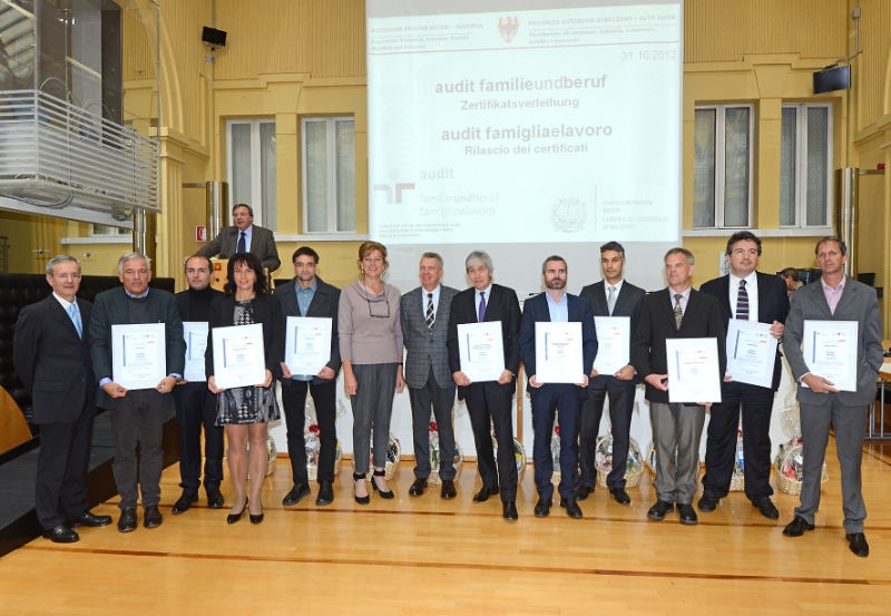 Zehn weitere Südtiroler Unternehmen wurden am 31. Oktober im Palais Widmann in Bozen mit dem Zertifikat "audit familieundberuf" ausgezeichnet, die das Land Südtirol und die Handelskammer gemeinsam verleihen. Damit wächst die Anzahl der familienfreundlichen Unternehmen auf 30 und die Mitarbeitendenzahl auf 13.500.
