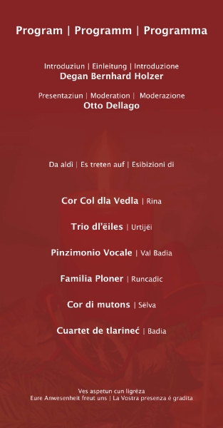 singen und musizieren der Grödner Frauendreigesang mit Monika Kelder Venturini, Claudia Klöcker Moroder und Petra Seifart Delazer, begleitet auf der Gitarre von Otto Delago; der Chor Col dla Vedla aus Welschellen unter der Leitung von Lois Huber; der Kinderchor mit 25 Kindern zwischen acht und vierzehn Jahren aus Wolkenstein, dirigiert von Paul Senoner; das Klarinettenquartett Abtei mit Filippo Palombo, Raimund Pizzinini, Roman Pizzinini und Friedl Pescoller; das Streichensemble der Familie Ploner aus Runggaditsch - St. Ulrich sowie das Vokalensemble Pinzimonio Vocale, zusammengesetzt aus Gudrun Mayrl (Sopran), Irene Clara (Sopran), Elisabeth Fistill (Alt), Renzo Huber (Tenor) und Raimund Pitscheider (Bass).