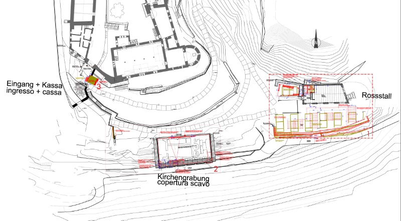 LPA - Auf Schloss Tirol stehen in den kommenden Monaten bis zur Wiedereröffnung im März 2013 eine Reihe von Verbesserungsarbeiten an. Geplant sind der Bau eines neuen Kassegebäudes, eines neuen unterirdischen Museumsdepots sowie bautechnische Maßnahmen bei den Kirchengrabungen. Die Bauarbeiten, die das Landesamt für Bauerhaltung koordiniert, wurden nun im Amt für Verwaltungsangelegenheiten der Landesabteilung Hochbau zugeschlagen.