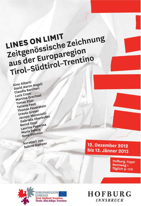 In der Ausstellung "Lines on Limit - Zeitgenössische Zeichnung aus der Europaregion Tirol-Südtirol-Trentino" in der Innsbrucker Hofburg werden die Künstler Gino Alberti, David Aaron Angeli, Claudia Barcheri, Luca Coser, Martina Drechsel, Tomas Eller, Tatiana Festi, Thomas Feuerstein, Ursula Groser, Jacopo Mazzonelli, Gabriela Oberkofler, Bernd Oppl, Laurina Paperina, Maria Peters und Rens Veltman vertreten sein.