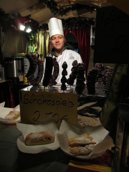 "Das war gar nicht so einfach", meint Hannes aus St. Leonhard, "man muss genau untersuchen, was es schon gibt und womit man Erfolg haben könnte." Thomas Peintner, der bereits seit vielen Jahren auf dem Meraner Weihnachtsmarkt einen Stand betreibt, hat den Schülern die Möglichkeit geboten, diese Erfahrung vor Ort zu machen und gemeinsam mit den Jungs überlegt, wie man das Ganze angehen könnte. "Schwierig war es, einen fairen Preis zu finden", meint Johannes aus Latsch, "wir wollen nicht zu teuer sein, aber trotzdem Gewinn machen." Die Schüler, die dann eigenständig eingekauft, gekocht, kalkuliert und präsentiert haben, bieten von Sarner Striezln über Krapfen und Schokofrüchte am Spieß all das an, was dem Gesamtkonzept der regionalen Südtiroler Küche entspricht.