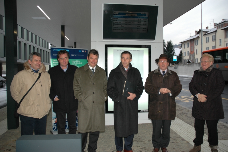 Knapp 1,5 Stunden vor der Inbetriebnahme des Busbahnhofs Brixen im neuen Kleid führte Landesrat Thomas Widmann heute gemeinsam mit dem Bürgermeister Albert Pürgstaller, den Projektverantwortlichen, Mitarbeitern und den Medienvertretern einen Lokalaugenschein durch und stellte die verschiedenen Neuerungen vor.